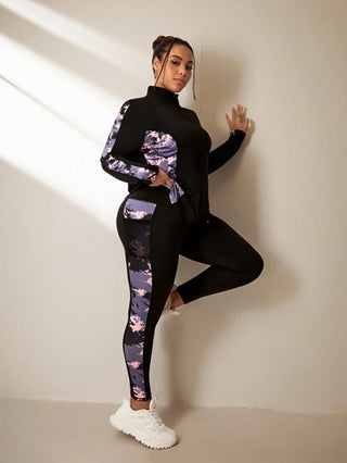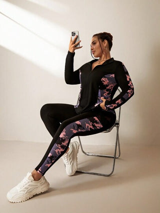 Sport Studio مجموعة ملابس رياضية كاجوال للنساء من قطعتين ملابس علوية مع سحاب أمامي وبنطلون للمقاسات الكبيرة، أكمام طويلة بالألوان موحد اللون