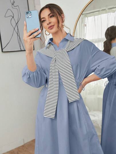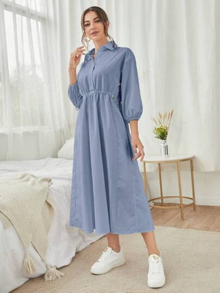 فساتين حريمي Mulvari فستان وسط برباط أكمام جرس بلون واحد طويل مع أزرار أمامية