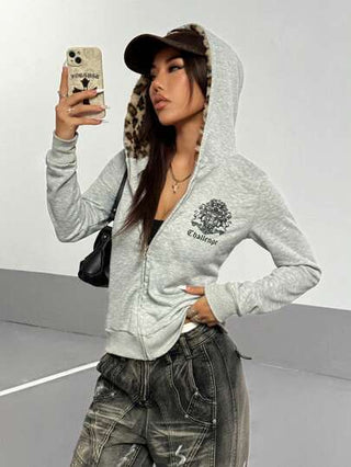 StreetHx منفذة الطباعة النمر الرمادية إمرأة قطنية مطبوع عليها رسوم غوطية ذات قلنسوة وياقة مصمتة للخريف/الشتاء
