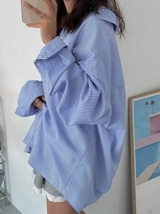 Strévra بلوزة نسائية فضفاضة مخططة صالحة للاستخدام، ذات طوق منحني، باللون الأزرق، مناسبة للربيع/الصيف/الخريف