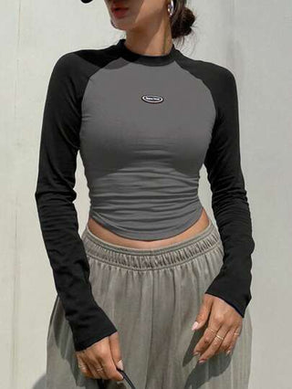 Strévra تي شيرت مقسوم إلى كتل لونية بأكمام طويلة بنمط راجلان مزخرف بالأحرف Y2K