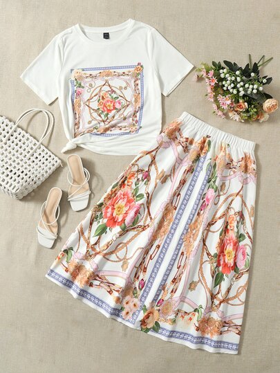 طقم حريمي قطعتين Mulvari طقم قطعتين تيشيرت وتنورة مطبوع بالزهور والسلاسل