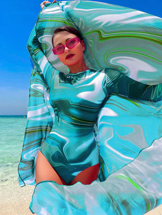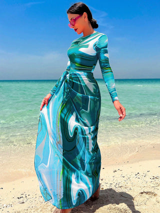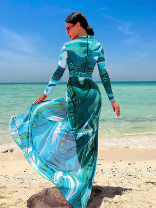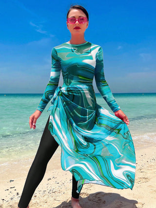 Swim Shayni بدلة سباحة قطعة واحدة مطبوعة بالتصميم الكامل مع تنورة شاطئية ،ملابس شاطئية عربية صيفية