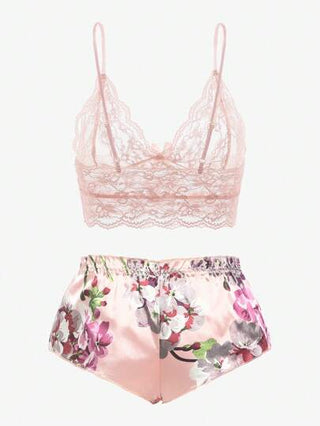 حمالة صدر بتفاصيل زهرية مع سراويل قصيرة زهرية، ملابس داخلية
