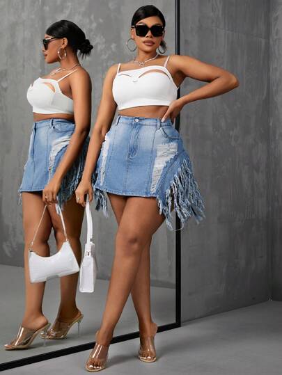 SXY تنورة جينز مصممة بشكل جذاب وجريء من ثوب مصنوع من الجينز بمقاس كبير غير مطاطي قصيرة