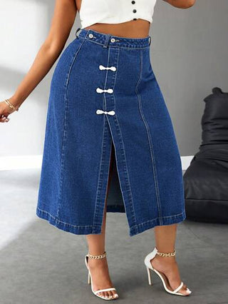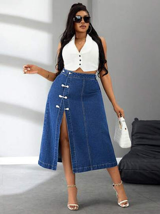 SXY تنورة ماكسي من الدنيم غير القابل للإطالة غير متماثلة مع إغلاق بالأزرار، طراز صيني جديد للمقاسات الكبيرة