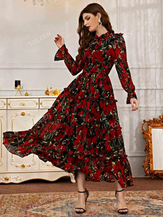 فساتين حريمي فستان طباعة الأزهار اكمام منتفضة حافة مكشكشة