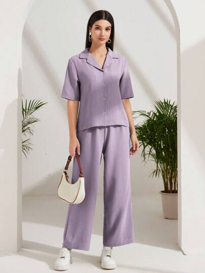 طقم حريمي قطعتين Mulvari قميص بزرّ أمامي ذو طوق قصير، وبنطال ساق واسعة، طقم من قطعتين