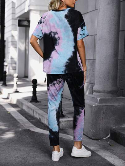 SHEIN LUNE مجموعة تي شيرت بعنق V وبنطال من القطن المرقع