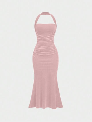 فساتين حريمي Sweetra فستان نسائي ماكسي سادة بياقة حالتر ذو طيات بشكل ذيل السمكة