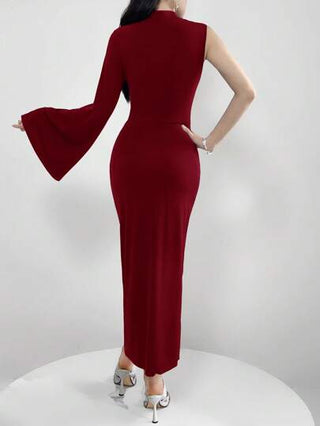 فساتين حريمي Modelyn فستان أنيق طويل للسهرات ذو لون أحمر غامق صلب بياقة مرتفعة وأكمام منفرجة وخط أسفل أنبوبي مع ذيل مرسوم كقصة الحورية، مناسب للربيع والصيف للمرأة