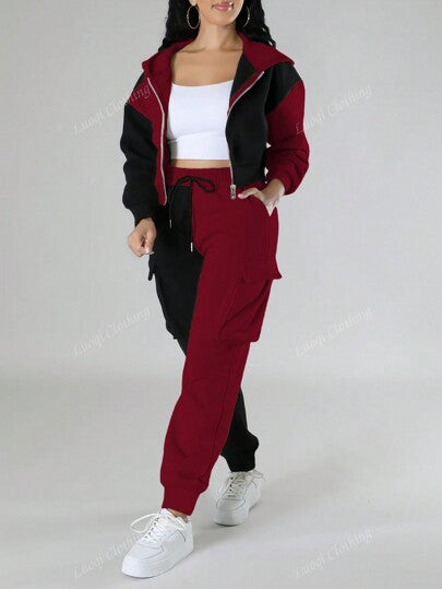 مجموعتين للنساء بطراز رياضي: جاكت أبيض أسود قصير مقنع + بنطلون رياضي كاربو ،فرو داخلي سميك للخريف والشتاء