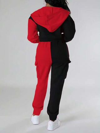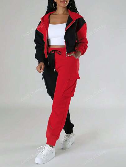مجموعتين من مجموعة رياضية للسيدات، جاكيت كابوت ذات رباط قابل للسحب بألوان متعددة سميكة من الفليس، وبنطلون رياضي كاركو للخريف/الشتاء