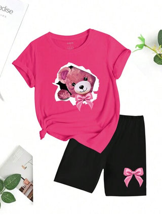 طقم حريمي قطعتين مجموعة بلوزة مطبوعة بالدببة الجميلة وشورت بتفاصيل عقدة للنساء