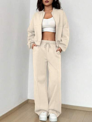 Flirla مجموعة من قطعتين، سترة بيسبول مقفولة بسحاب أمامي وسروال واسع برباط على الخصر للنساء