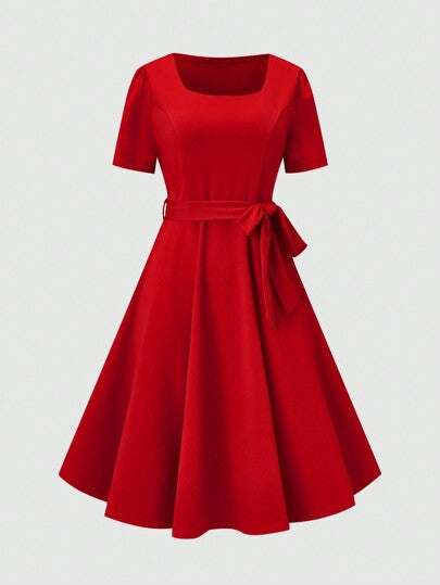 فساتين حريمي Clasi فستان بياقة مربعة بنمط أحادي اللون مع حزام الخصر للنساء لملابس السنة الجديدة، فستان طويل(ماكسي) للسيدات