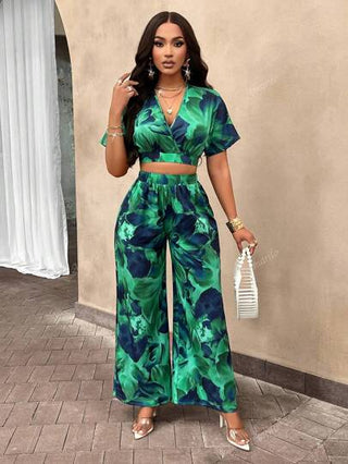 طقم حريمي قطعتين طقم بلوزة بأكمام واسعة وقصيرة ورقبة على شكل V وحزام يربط حول الخصر مع سروال بأرجل واسعة مجموعة مطبوعة كاملة عشوائية الطباعة (للنساء)