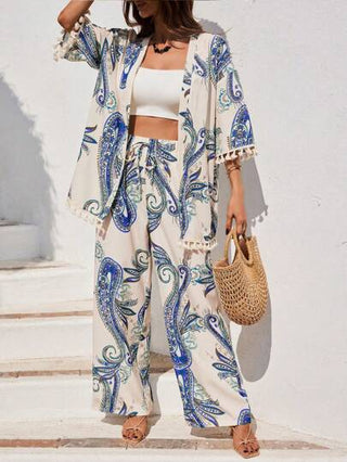طقم حريمي قطعتين Breezaya مجموعة فضفاضة من قطعتين على الطراز البوهيمي للنساء، بحاكي كردجان مع طباعة وردة بايزلي، أكمام متدلية، وأمام مفتوح ،وبنطلون واسع الساق للاستخدام في فصلي الربيع والصيف