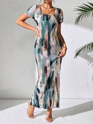 فساتين حريمي Rafferiza فستان نسائي طويل بياقة مربعة ومنتصف الكتف مع طباعة صبغة التعرية الأنيق