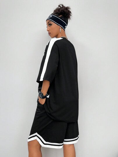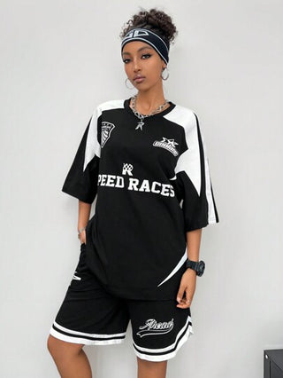Coolane مجموعة تي شيرت رياضي مطبوع بطباعة الموتو الشارع ذات طبعات ركوب الدراجات النارية وشورت كرة السلة، قطعتان، للنساء