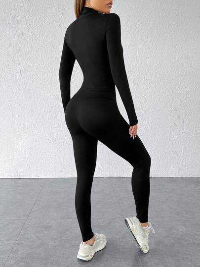 SHEIN PETITE ملابس رياضية مجموعة من قطعتين سوداء، جاكيت رياضية بسحاب وبنطلون ضيق