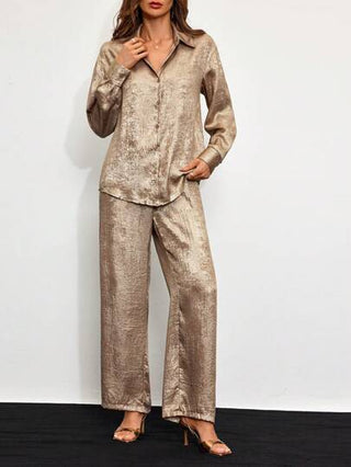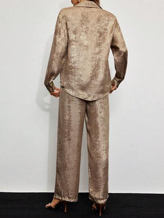 طقم حريمي قطعتين Clasi بدلة قميص وبنطلون كاجوال أكمام طويلة من قماش معدني، ملابس نسائية كاجوال مرنة مكونة من بنطلون أكمام طويلة فضفاضة بأكتاف منسدلة وزيبر ذهبي للخريف والربيع، ملابس عادية لحفلات السنة الجديدة والمناسبات
