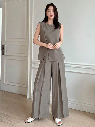 طقم حريمي قطعتين DAZY 2قطعة طقم ملابس علوية بدون أكمام وبنطال ساق واسعة لون سادة للنساء