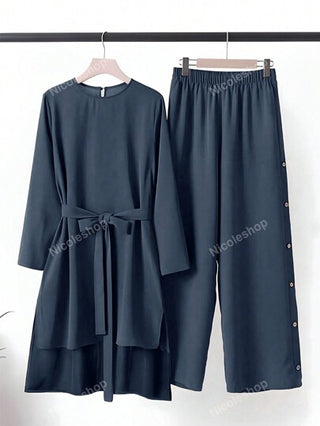 طقم حريمي قطعتين 2 قطعة مجموعة من البلوزة والبنطلون الفضفاض الملون للنساء، تصميم عالي/منخفض، للربيع والخريف