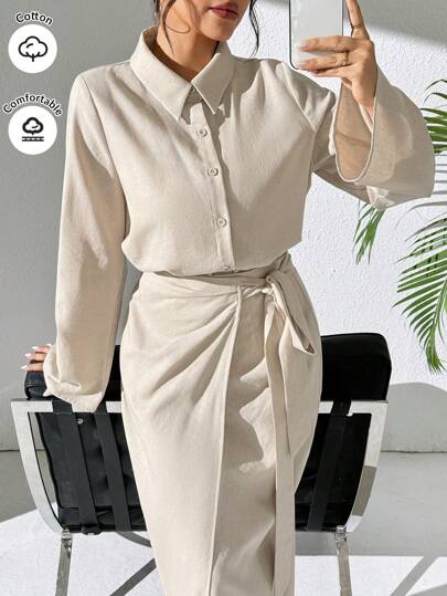 طقم حريمي قطعتين Mulvari طقم ملابس علوية كاجوال بأكمام طويلة وتنورة خصر بأربطة ملونة طقم من قطعتين للنساء