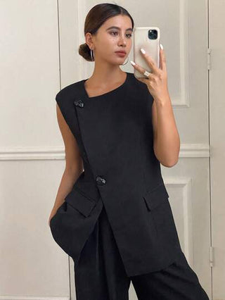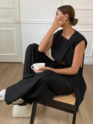 طقم حريمي قطعتين DAZY طقم جاكيت بدون أكمام و بنطلون واسع الساق بلون أحادي للنساء 2 قطعة