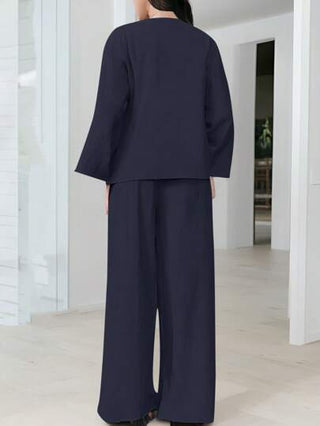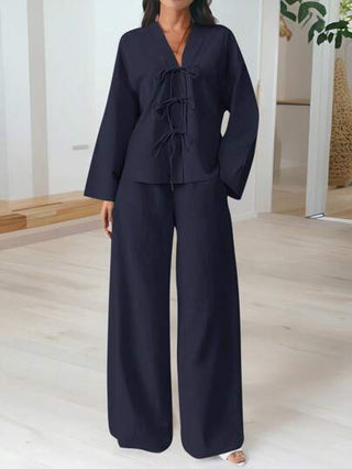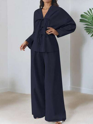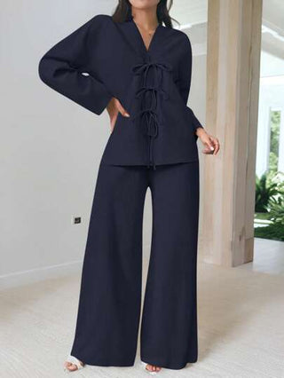طقم حريمي قطعتين Firerie مجموعة قطعتين للنساء: قميص كاجوال فضفاض مُربوط أمامي أنيق وبنطلون ذو خصر مرتفع مطاطي خصر واسع الساق، كاجوال مناسب للعمل