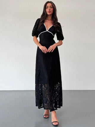 فساتين حريمي Aloruh فستان ماكسي ضيق الخصر أنيق أسود مزين بالدانتيل عميق الياقة مع تريم تباين وأكمام منتفخة، موسم الربيع والصيف