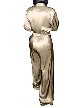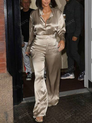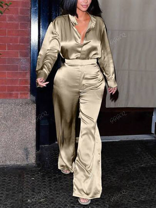 طقم حريمي قطعتين مجموعة بنطلون وقميص أنيقة مكونة من قطعتين، ذات لون أحادي للنساء للموسم الخريفي