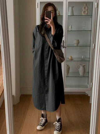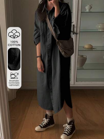 فساتين حريمي DAZY فستان قميص كاجوال فضفاض طويل الأكمام موحد اللون للنساء، الربيع والصيف