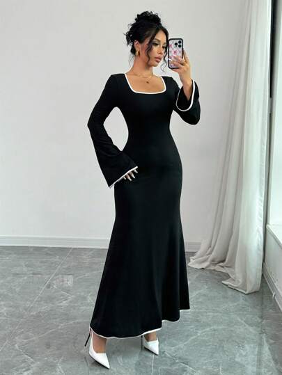فساتين حريمي Elenzga فستان أنيق ماكسي بأكمام جرس وياقة مربعة للنساء للربيع/الصيف