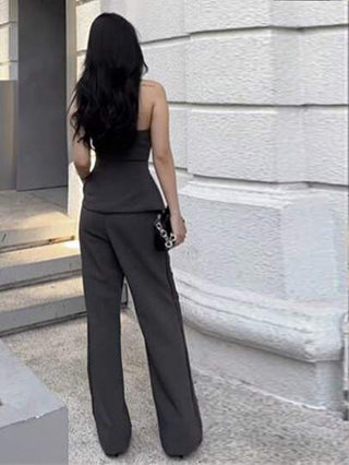 طقم حريمي قطعتين INAWLY طقم 2 قطعة من ملابس علوية أنبوبي أمامي أزرار صلبة وبنطلون مزين بجيب، طقم أنيق للسيدات