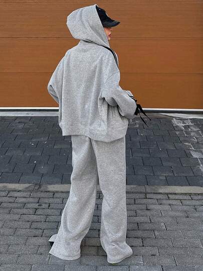 DAZY مجموعة بلوزة هودي ذات لونين وبنطلون ساق واسعة للنساء قطعتان