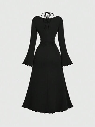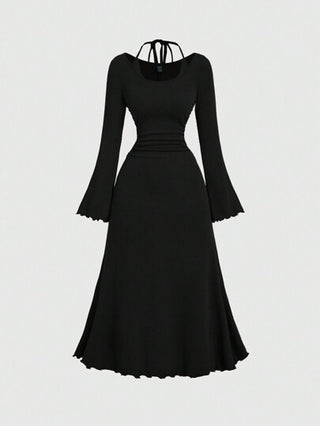 فساتين حريمي MOD فستان سهرة نسائي أسود بياقة عالية متناسق ذو أكمام طويلة وذيل كريمة إلى الركبة
