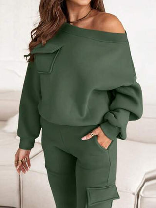 طقم حريمي قطعتين INAWLY بنطلون كاجوال بجيب وبلوزة كتف مائلة مجموعة من 2 قطعة للنساء