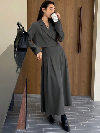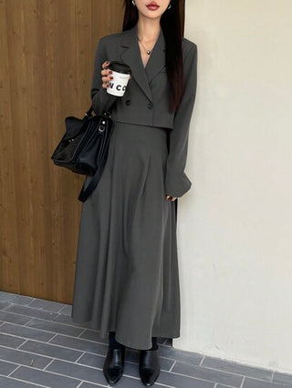 طقم حريمي قطعتين DAZY مجموعة قطعتين من ملابس علوية طويلة الأكمام برقبة صدفية وتنورة ذات لون أحادي، ملابس كاجوال للنساء، خريفية