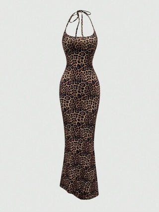 فساتين حريمي Flirla فستان نسائي ماكسي أنيق بتصميم الذيل مرمري بطبعة الفهد، بياقة عالية