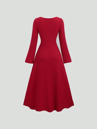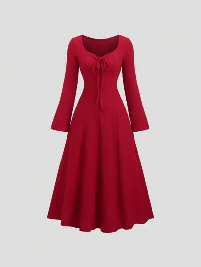 فساتين حريمي Sweetra فستان نسائي خريفي بياقة قلبية، بأكمام فرفرة ضيقة وخصر مشدود، باللون البوردو