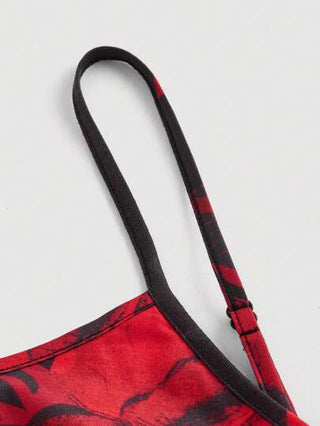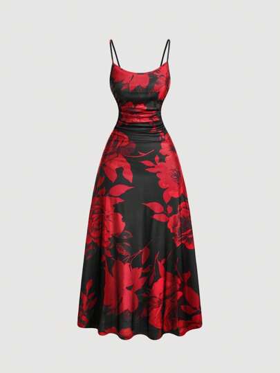 فساتين حريمي MOD فستان بحمالات سباغيتي مطوّي الخصر ومطبوع بطباعة زهور حمراء، ملابس نسائية لرأس السنة الجديدة، فستان ليلة رأس السنة، ملابس للمهرجانات، فساتين سهرة نسائية أنيقة، فستان للمهرجانات