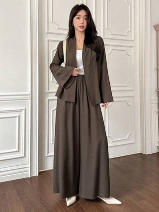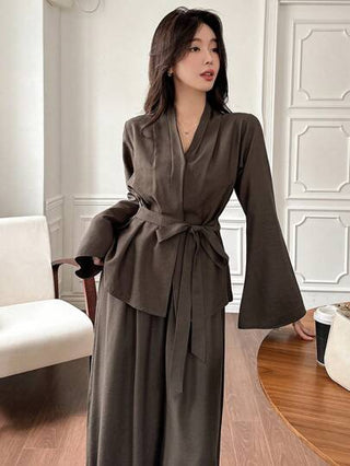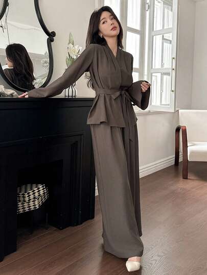 طقم حريمي قطعتين DAZY طقم بلوزة رقبة على شكل حرف V وبنطال الخصر الطويل من قطعتين للنساء