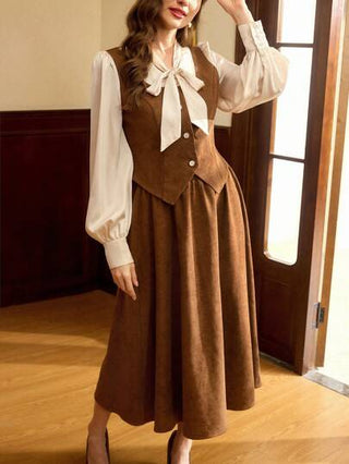 طقم حريمي قطعتين Vintamour مجموعة نسائية أنيقة عتيقة قطعتين، لوحة ألوان متباينة مطابقة، ديكور شريطي ومزين بالفيونكة، ملابس علوية وأسفل بلون الكاكاو، ملابس خريفية/ شتوية، مجموعة ملابس للنساء في ، مجموعتان قطعتان ،بني، مجموعة عيد الحب الشريطي