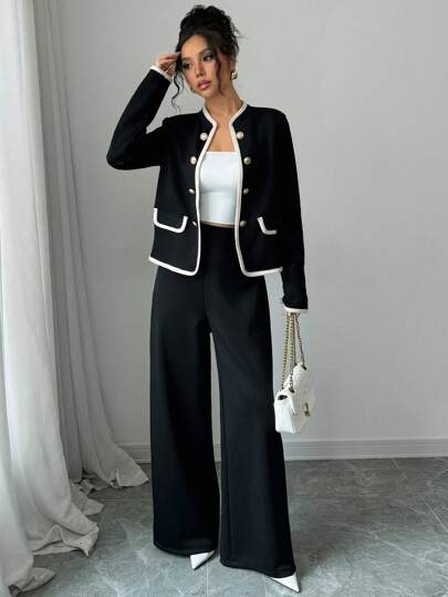 طقم حريمي قطعتين Siren Gaze طقم بنطلون وجاكيت كاجوال نسائي بتريم م-ت-باين الل-ون أس-ود ، طق-م أنيق لشتاء وخريف ، ب-دلة م-ك-تبي-ة رس-مي-ة