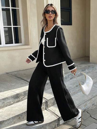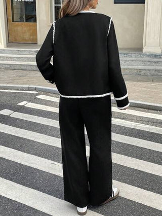 طقم حريمي قطعتين Frenchy مجموعة نسائية من قطعتين: جاكيت معرضة بشريط موزع وحواف اللون، أكمام طويلة، وصدرية وردة واحدة بجيوب معدنية، تشكيلة كاملة ذات ملمس، أنيقة، مناسبة للخريف/الشتاء، مرتدى للذهاب إلى المكتب والحياة اليومية