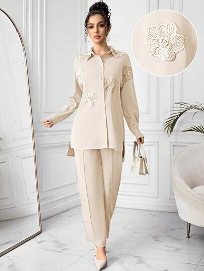 طقم حريمي قطعتين Modelyn العيد طقم امرأة أناقة 2 قطعة زهرة ثلاثية الأبعاد والبنطلون الطويل