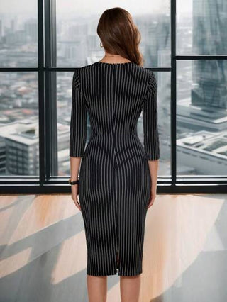 فساتين حريمي Clasi فستان شيث ذو طول الركبة مخطط باللون الأسود والأبيض، أكمام ٣/٤، ياقة محززة، ملابس عمل أنيقة، للعمل