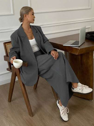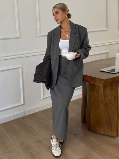 طقم حريمي قطعتين DAZY بدلة نسائية تتكون من بليزر و تنورة طويلة حتى الركبة، أكمام طويلة، كاجوال، متعددة الاستخدامات، مناسبة لجميع المواسم للأعمال والأوقات الحرة
